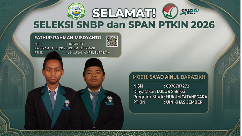 Fathur Rahman Misdiyanto berhasil lolos melalui jalur SNBP dan diterima di Universitas Islam Negeri Sunan Ampel (UINSA) Surabaya. Ia menembus Program Studi Sistem Informasi, sebuah capaian yang sangat linier dan relevan dengan kompetensi keahlian yang ia pelajari selama duduk di bangku SMK TI Annajiyah.